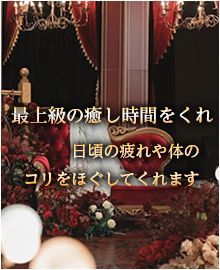 当店は、厳選されたセラピストのみで構成されたリラクゼション店です。端麗な容姿・洗練された技術・真心からのおもてなしで、お時間の許す限り最高級のサービスをご提供いたします。寛ぎの雰囲気の店内で、心には潤いと安らぎを、体には充足感と活力を、セラピストがお届けします。「また来たい。」と本当に思われるようなお時間をご堪能いただけるよう、お店作りに励みたいと思う所存です。どうぞよろしくお願いいたします。